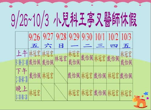 9/26(五)~10/3(五) 王亭又醫師休假如下圖: