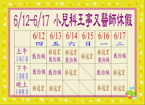 6/12(四)~6/17(二) 王亭又醫師休假: